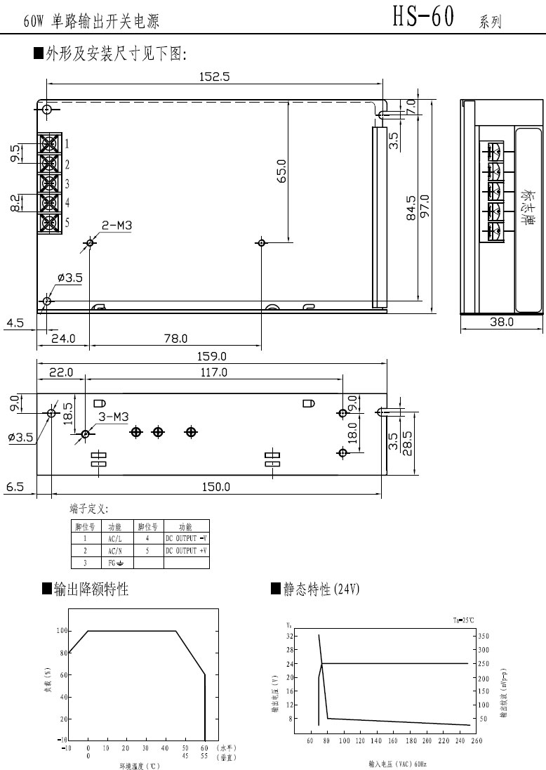 1.所有参数在未特别指明时,都是在230VAC电压输入,额定负载和25℃条件下测量所得值。 2.纹波和噪声电压是在20MHz带宽示波器带12英寸双绞线末端加0.1μ和47μ电容时测得。 3.容差是电压设定误差、电压调整率和电流调整率之总和。 4. 本电源考虑做为一个器件安装在最终设备上,该设备必须重新确认它的EMC指标。 5.具体输出电流见输出降额曲线。 |