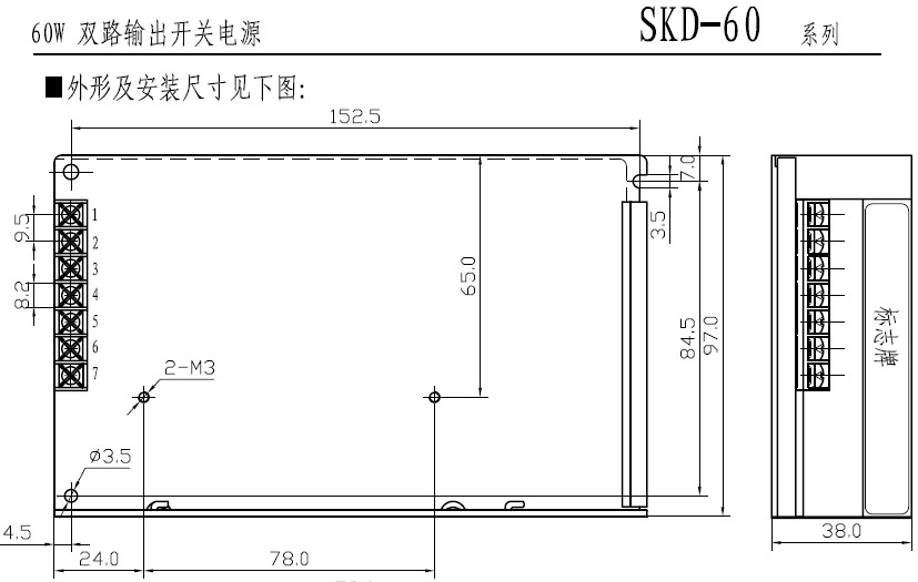 型号规格:HD-60双路输出开关电源 |