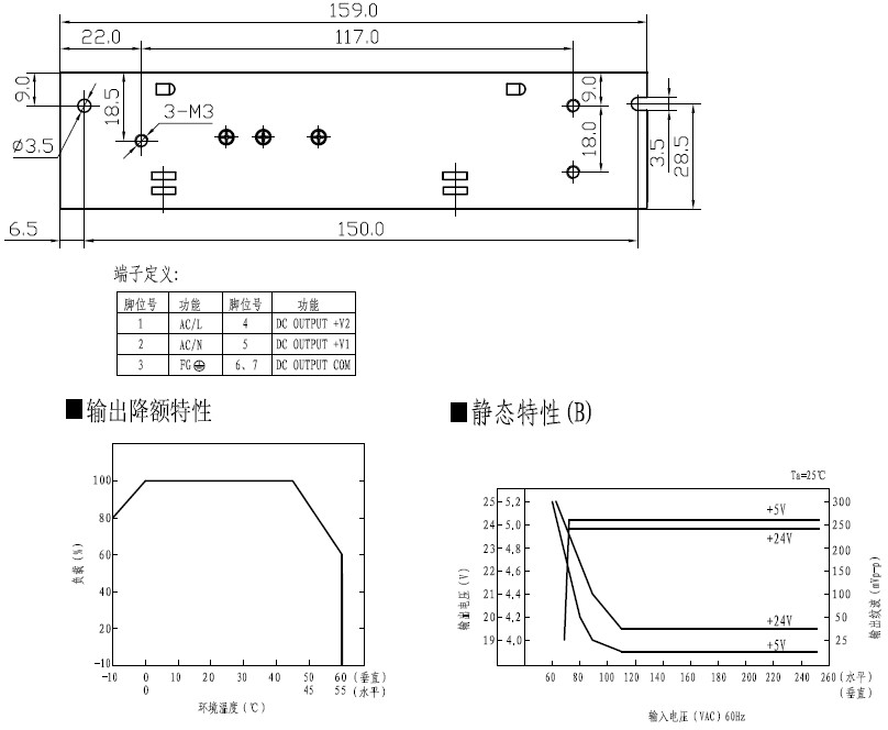 所有参数在未特别指明时,都是在230VAC电压输入,额定负载和25℃条件下测量所得值。 纹波和噪声电压是在20MHz带宽示波器带12英寸双绞线末端加0.1μ和47μ电容时测得。 容差是电压设定误差、电压调整率和电流调整率之总和。 本电源考虑做为一个器件安装在最终设备上,该设备必须重新确认它的EMC指标。 具体输出电流见输出降额曲线。 |